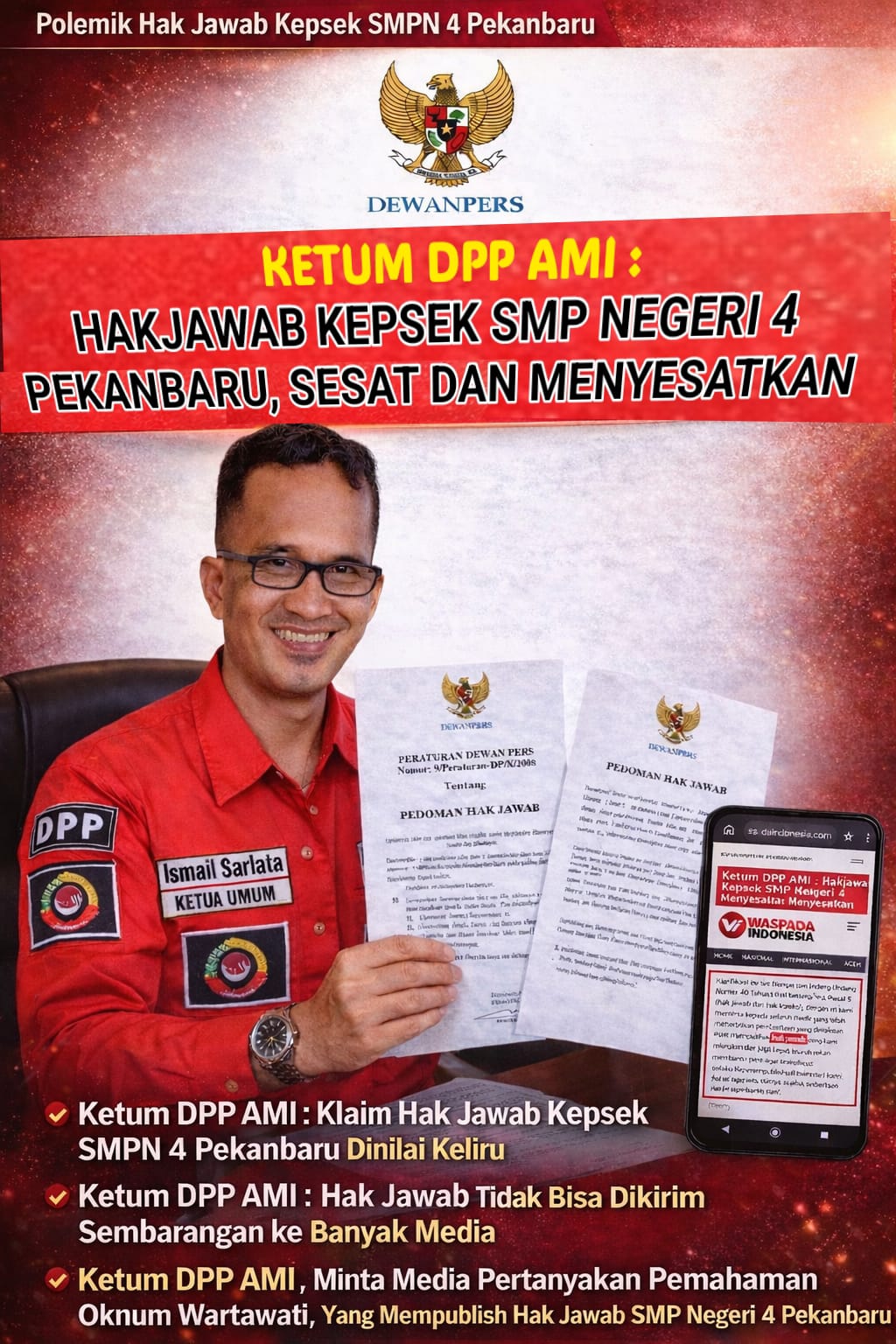 PEKANBARU | Pernyataan yang mengatasnamakan “klarifikasi” sekaligus “hak jawab” yang beredar di sejumlah media terkait Kepala Sekolah SMP Negeri 4 Pekanbaru dinilai keliru dan berpotensi menyesatkan pemahaman publik mengenai mekanisme hak jawab dalam praktik jurnalistik.