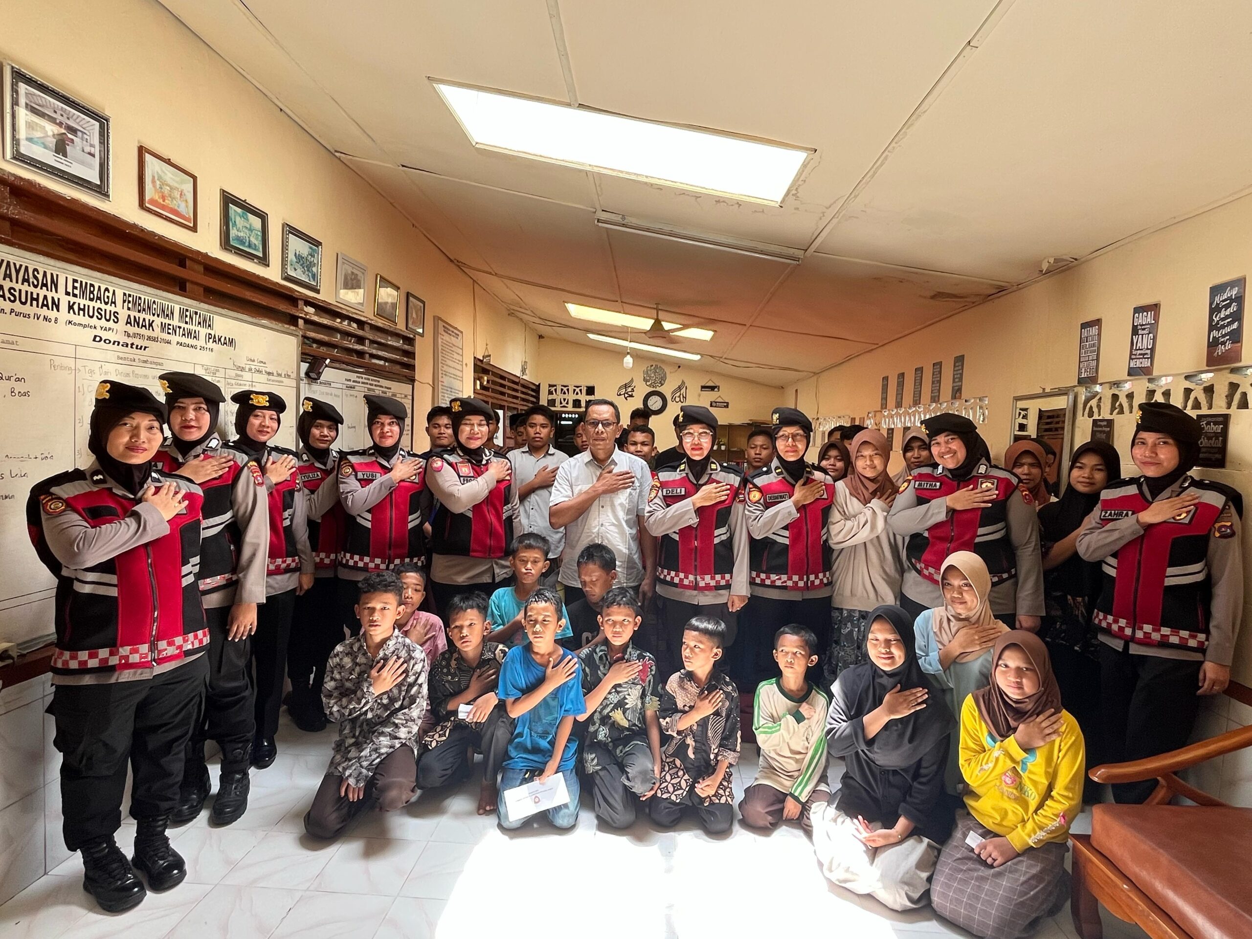 Dalam kesempatan tersebut, personel Polwan memberikan santunan kepada anak-anak panti sebagai wujud kepedulian untuk membantu meringankan kebutuhan mereka di bulan Ramadan.