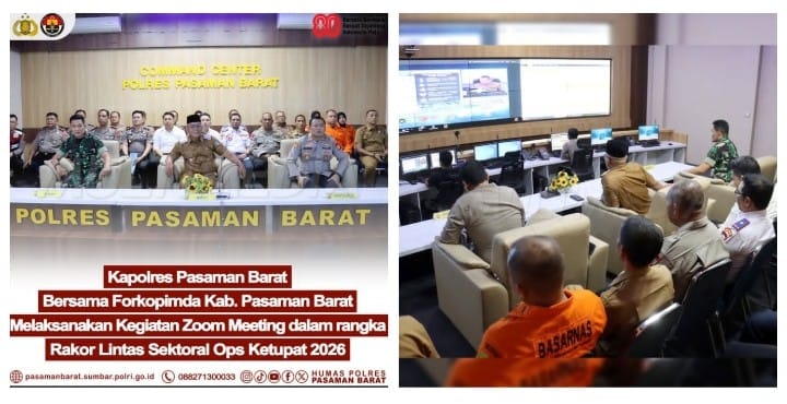 PASAMAN BARAT | Suasana serius namun penuh semangat tampak di ruang Command Center Polres Pasaman Barat ketika jajaran Forkopimda Kabupaten Pasaman Barat berkumpul mengikuti rapat koordinasi lintas sektoral melalui Zoom Meeting dalam rangka persiapan Operasi Ketupat 2026. Kegiatan ini dipimpin langsung oleh Kapolres Pasaman Barat AKBP Agung Tribawanto, S.I.K., yang menegaskan pentingnya sinergi seluruh unsur dalam menjaga keamanan masyarakat selama momentum Idul Fitri.