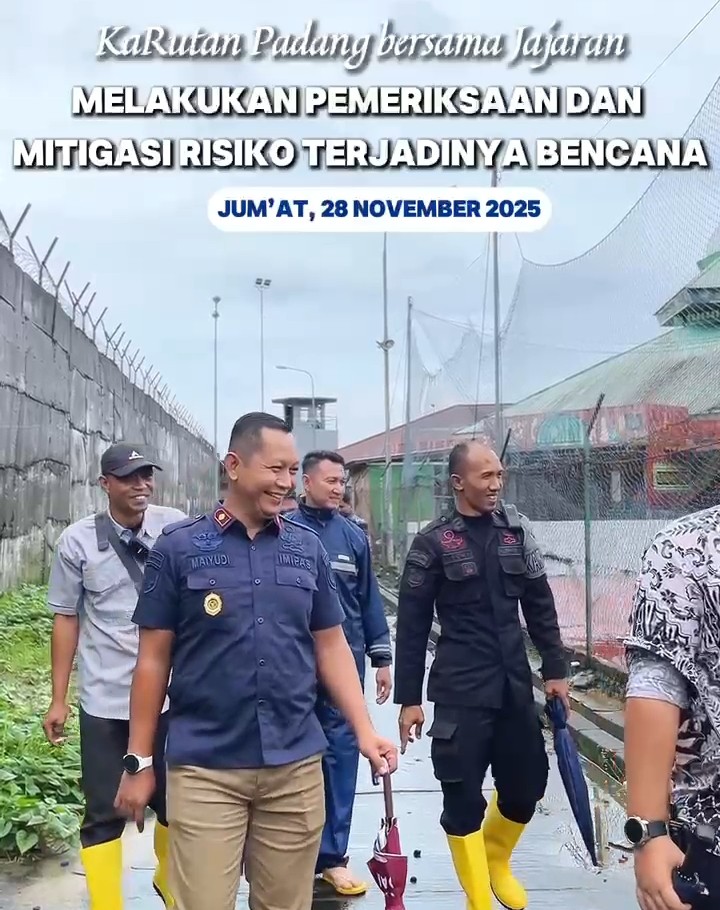 Padang | Kepala Rutan Kelas IIB Padang Mai Yudiansyah kembali menunjukkan komitmennya menjaga keamanan dan keselamatan seluruh warga binaan serta jajaran petugas melalui kegiatan pemeriksaan dan mitigasi risiko bencana yang digelar pada Jumat 28 November 2025.