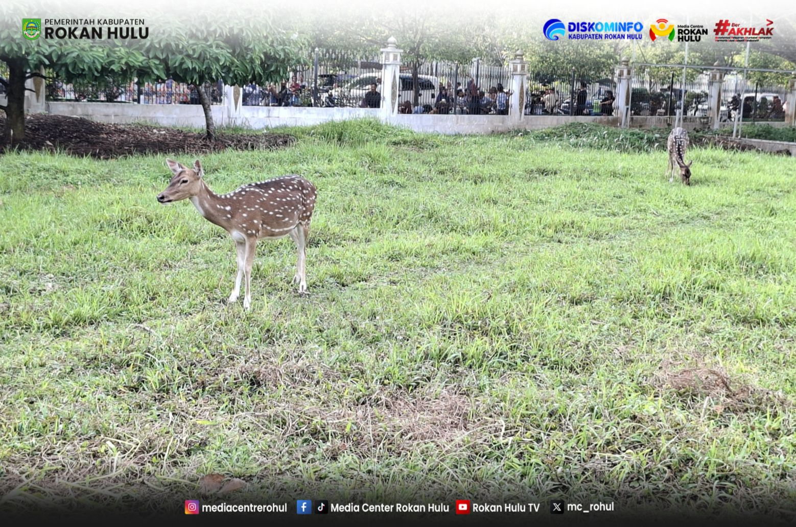 Tepat di depan kediaman dinas Bupati Rokan Hulu, pemandangan kontras terlihat. Jika biasanya kawasan ini kaku dengan aktivitas pemerintahan, kini ia berubah menjadi ruang publik yang hidup. Anak-anak berlarian kecil mengejar bayang-bayang pohon di Hutan Kota, sementara para orang tua tampak asyik mengabadikan momen di depan pagar Taman Kandang Rusa.