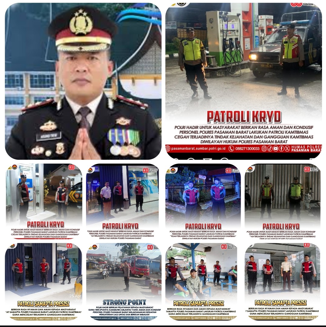 Pasaman Barat | Komitmen menghadirkan rasa aman dan nyaman di tengah masyarakat terus diperkuat oleh jajaran Polres Pasaman Barat di bawah kepemimpinan AKBP Agung Tribawanto, S.I.K. Melalui strategi patroli yang masif dan berkelanjutan, Kapolres menegaskan bahwa kehadiran polisi harus benar-benar dirasakan masyarakat dalam kehidupan sehari-hari.