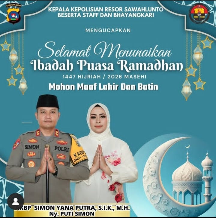 SAWAHLUNTO | Memasuki bulan suci Ramadhan 1447 Hijriah/2026 Masehi, suasana religius mulai terasa di Kota Sawahlunto. Umat Muslim bersiap menyambut bulan penuh berkah dengan hati yang bersih dan semangat baru. Dalam momentum sakral ini, Kepala Kepolisian Resor Sawahlunto, AKBP Simon Yana Putra, S.I.K., M.H., bersama staf dan Bhayangkari, menyampaikan ucapan selamat menunaikan ibadah puasa kepada seluruh masyarakat.