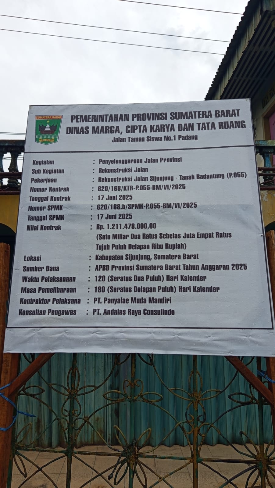 SIJUNJUNG | Proyek penanganan longsor pada ruas Tanah Badantuang–Tanjung Ampalu, Kabupaten Sijunjung, yang dikelola Dinas Bina Marga, Cipta Karya dan Tata Ruang (BMCKTR) Provinsi Sumatera Barat kini berada dalam pusaran sorotan publik. Proyek dengan nilai anggaran lebih dari Rp1,2 miliar itu disebut telah rampung pasca pekerjaan 28 Juli 2025. Namun belum genap setahun, kondisi fisiknya justru memicu kekhawatiran serius.