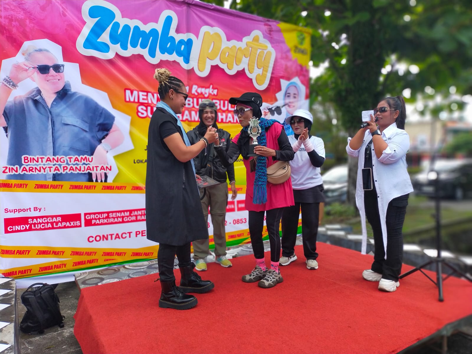 Menariknya, selain gerakan zumba energik yang menjadi ciri khas, para peserta juga menampilkan variasi “Senam Zombi” yang sempat viral di media sosial. Dengan gerakan khas tangan terulur dan langkah kaki berat namun tetap ritmis mengikuti musik bertema horor yang upbeat, senam ini sukses mengundang gelak tawa dan antusiasme warga yang menyaksikan.