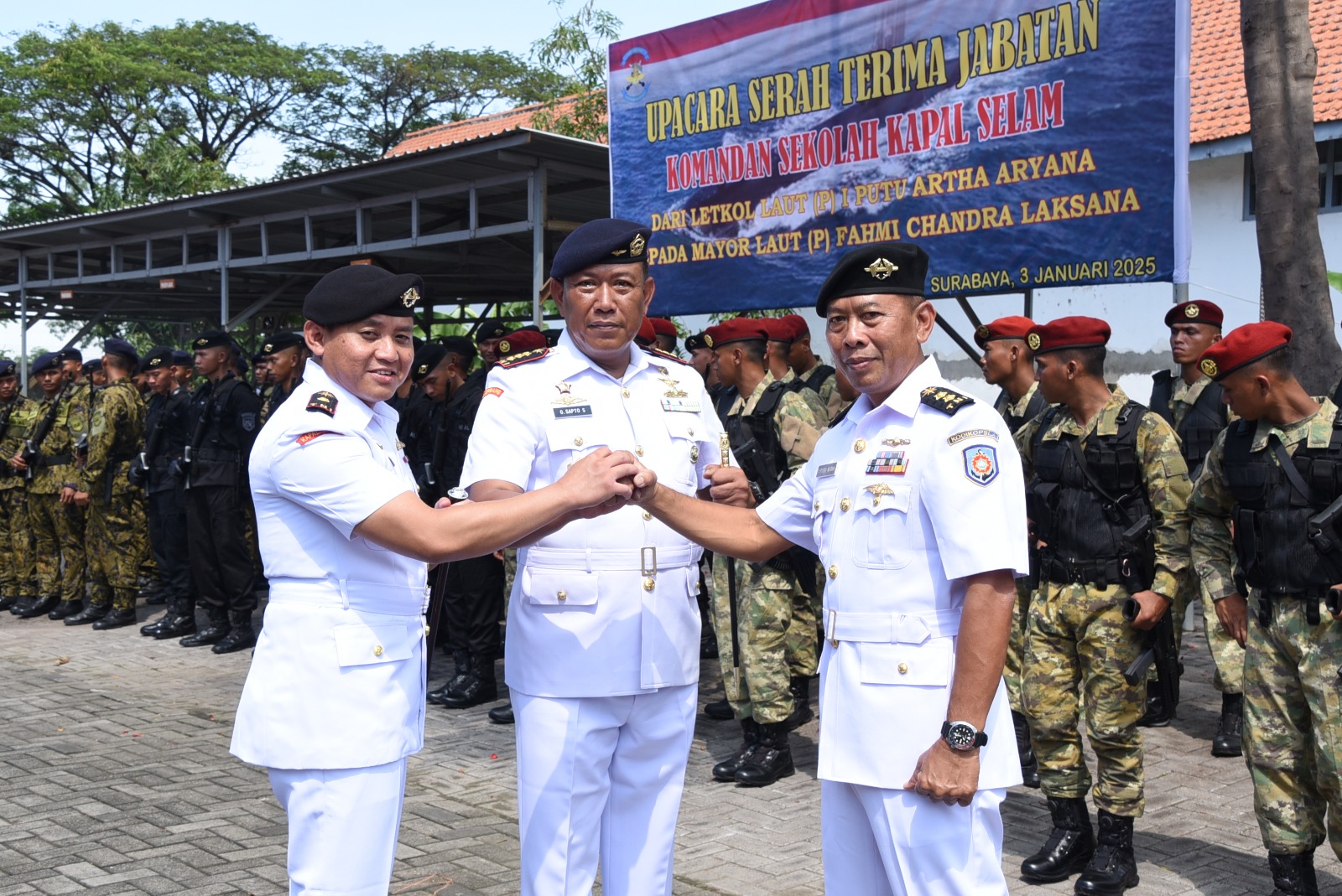 TNI AL. Kodiklatal. Surabaya, 04 Januari 2025 | Komandan Pusdiksus (Danpusdiksus) Kodikopsla Kodiklatal Kolonel Laut (P) Gering Sapto Sambodo memimpin Serah Terima Jabatan (Sertijab) Komandan Sekolah Kapal Selam (Dansekasel) dari Letkol Laut (P) I Putu Artha Aryana kepada Mayor Laut (P) Fahmi Chandra Laksana, bertempat di Lapangan Apel Sekasel Pusdiksus, Ujung Surabaya. Jumat, (03/01/2025).
